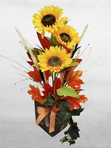 Hozd be otthonodba az ősz meleg hangulatát ezzel a gyönyörű, kézzel készült őszi lakásdekorációval. Am sötétszürke, elegáns négyzet alakú kaspó modern megjelenést biztosít, míg a narancssárga juhar levelek és kúszó borostyán természetes, harmonikus összhatást keltenek. A sárga moha és a közepén elhelyezett három szál ragyogó napraforgó vidám, napfényes hangulatot áraszt, amely bármely helyiség éke lehet.