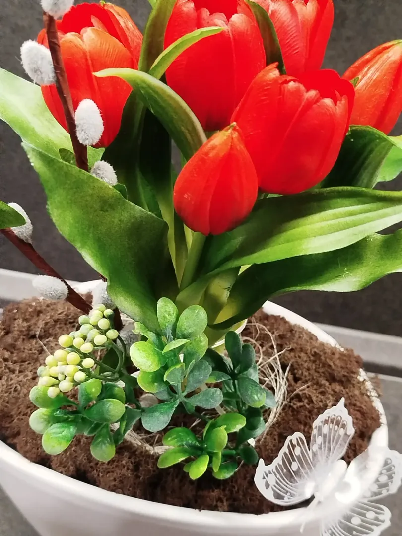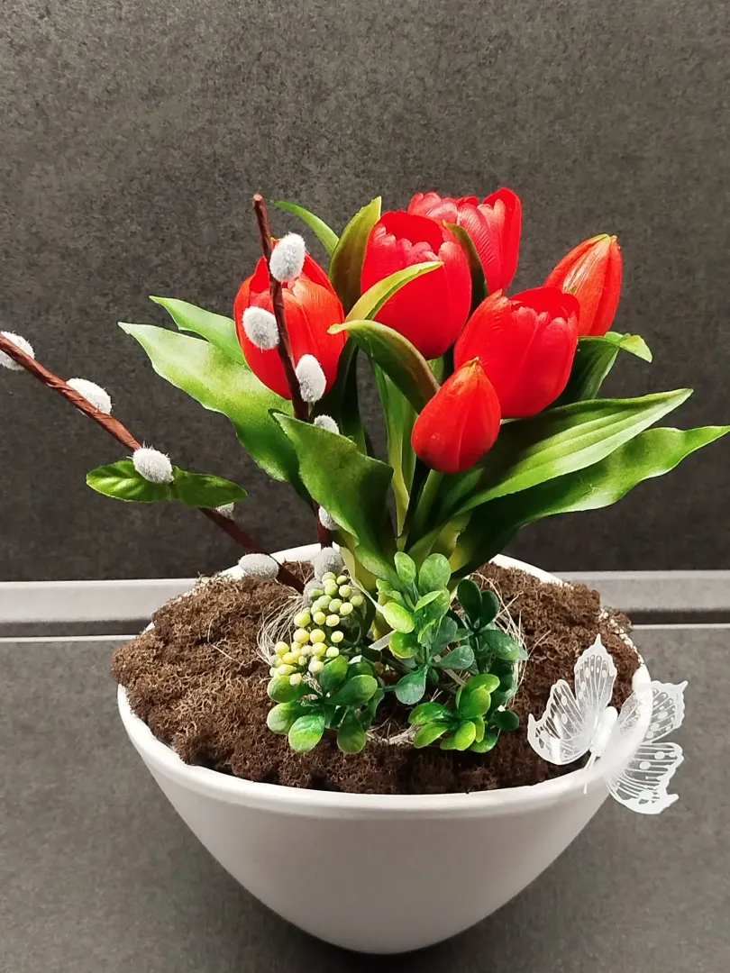 Letisztult forma, finom tavaszi színek és időtálló elegancia. Ez a kézzel készített virágdekoráció tökéletes választás nőnapra, ajándéknak vagy otthoni dísznek- modern, mégis meleg hangulatot teremt. A kompozíció gondosan válogatott, prémium minőségű művirágokból készült, melyek hosszú ideig megőrzik szépségüket. A természetes barna moha és az apró tavaszi részletek különleges, harmonikus összképet adnak.