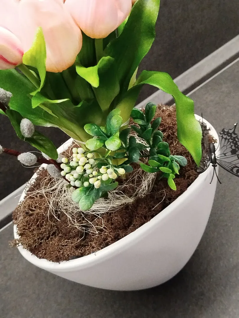 Letisztult forma, finom tavaszi színek és időtálló elegancia. Ez a kézzel készített virágdekoráció tökéletes választás nőnapra, ajándéknak vagy otthoni dísznek- modern, mégis meleg hangulatot teremt. A kompozíció gondosan válogatott, prémium minőségű művirágokból készült, melyek hosszú ideig megőrzik szépségüket. A természetes barna moha és az apró tavaszi részletek különleges, harmonikus összképet adnak.