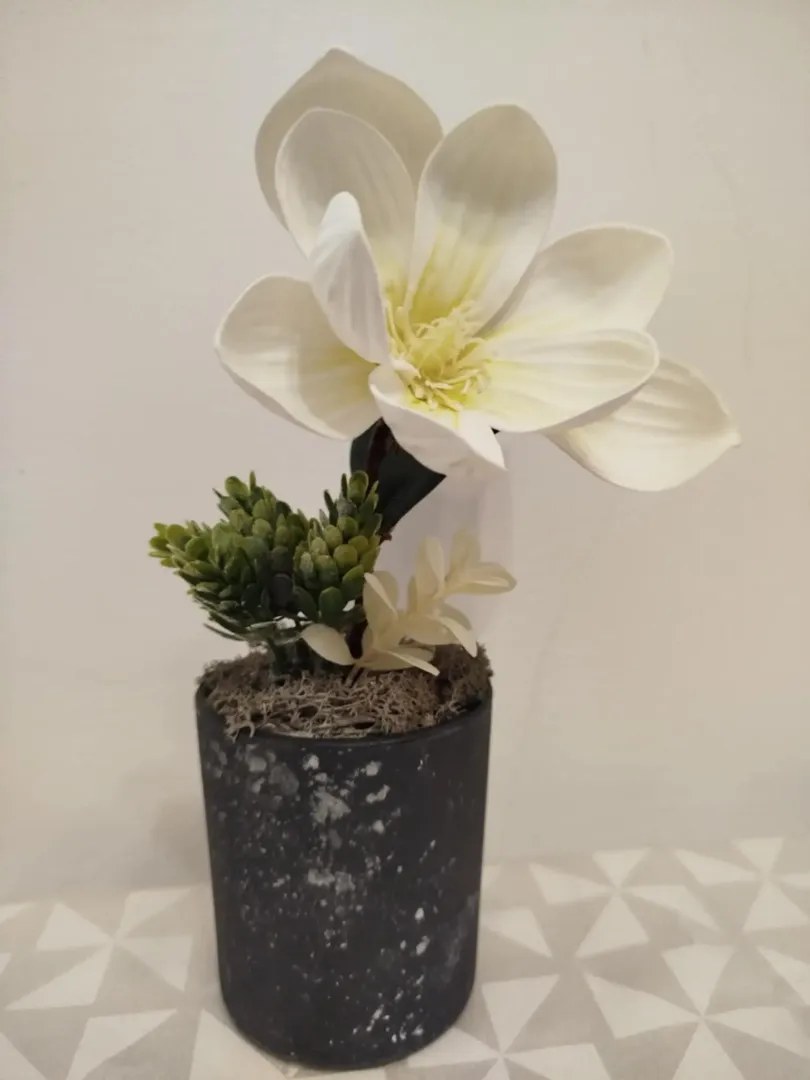 Ez a légies és elegáns kézzel készült művirág dekoráció frissítő hangulatot hoz bármelyik helyiségbe. A finom fehér művirág és a természetes moha szépen kiegészítik egymást, míg a fekete, modern márványhatású kaspó stílusos megjelenést biztosít. Tökéletes választás, ha egy kis nyugalmat szeretnél csempészni otthonodba. Bővebben