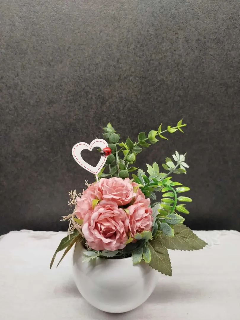 Ez az ízléses, kézzel készült virágkompozíció a finom rózsaszín virágokkal és friss zöld levelekkel azonnal meghitt hangulatot teremt. A fehér gömbölyű, magasfényű kaspó eleganciát sugároz, amely tökéletesen kiemeli a virágok szépségét. A dekoráció különlegessége, a kedves szív alakú dísz, rajta katicával, ami szeretetteljes üzentet közvetít! Tartós művirágból készült, így gondozásmentesen őrzi a szépségét, legyen szó nappali díszről, irodai kiegészítőről vagy akár ajándékról.