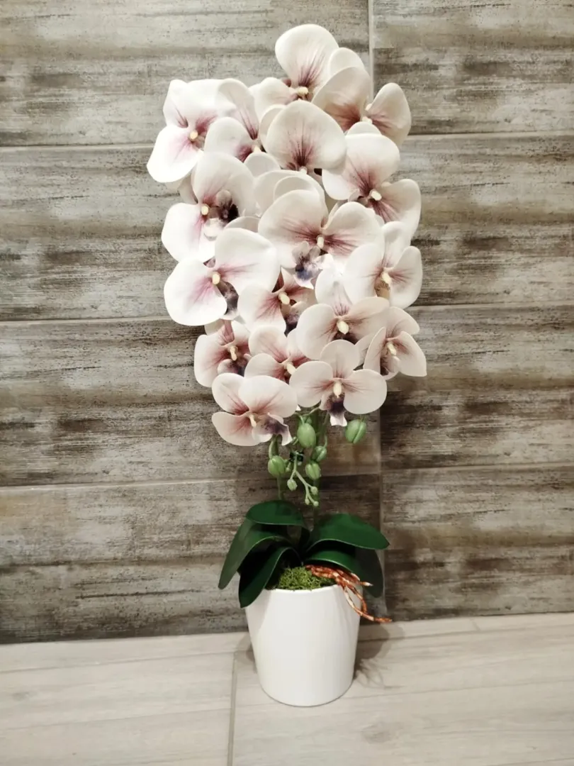 A finoman átmenetes lilás-fehér orchidea szirmai eleganciát sugároznak, amit a friss tónusú világoszöld moha még üdébbé varázsol. A visszafogott, stílusos fehér kaspó modern keretet ad az egész kompozíciónak. Ez a részletgazdag, kézműves művirág kiváló választás, ha hosszú távú, mégis élethű lakásdekor művirágot keresel. Tökéletesen illik skandináv, minimál vagy romantikus enteriőrbe is. Gondozásmentes, mégis üde.