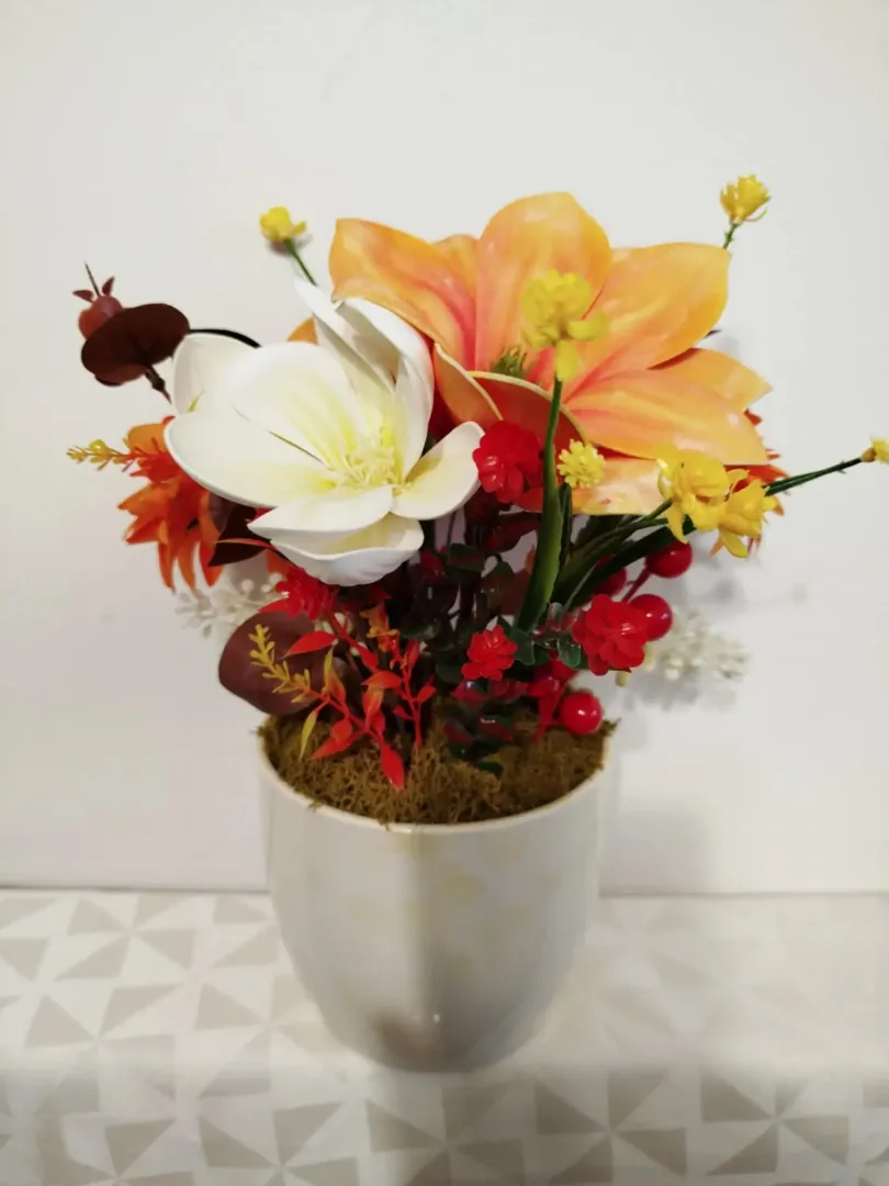 Őszi vegyes művirágok, világos kaspóban