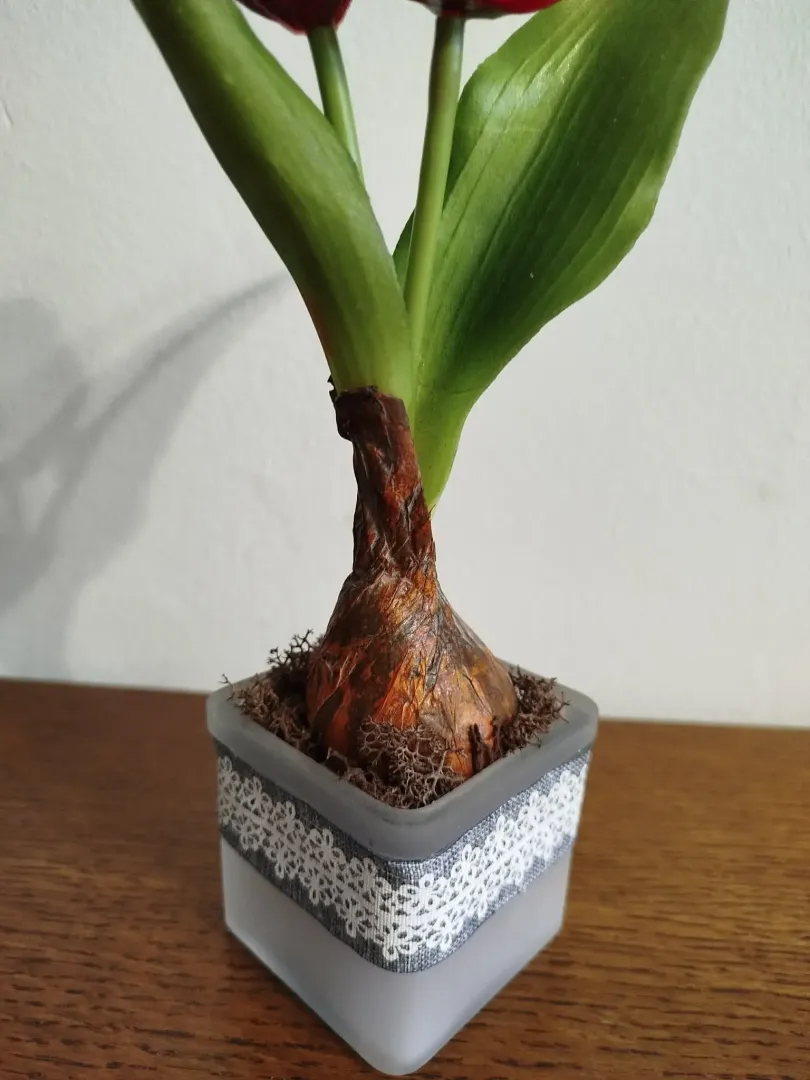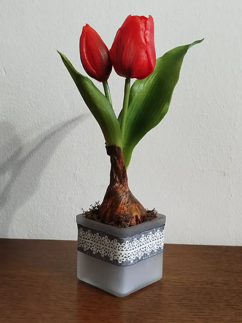 Letisztult, piros tulipános dekoráció modern üvegkaspóban. A természetes hatású hagyma és izlandi zuzmó finom kontrasztot ad a tiszta formáknak. Stílusos kiegészítő, amely gondozás nélkül is élénk színfoltot visz a térbe. Tökéletes választás otthonodba, irodádba vagy akár ajándéknak is! Bővebben