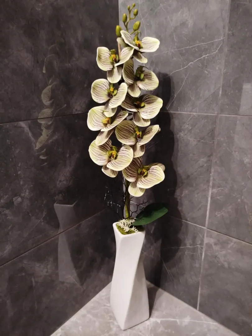 Prémium zöld csíkos orchidea, fehér csavart vázában