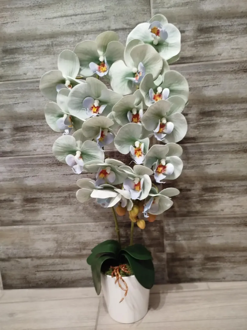 Ez a magas minőségű művirág karakteres színei és formája azonnal megragadja a tekintetet. A letisztult modern vonalvezetésű fehér csavart váza mely keretet ad ennek a stílusos kompozíciónak, amit természetes moha tesz még kifinomultabbá. Ez a gondosan megalkotott kézműves művirág tökéletes választás minden olyan térbe, ahol a dizájn és a természet ihlette szépség találkozik. Nem csupán lakásdekor, hanem egy valósághű, időtálló és egyediség is.
