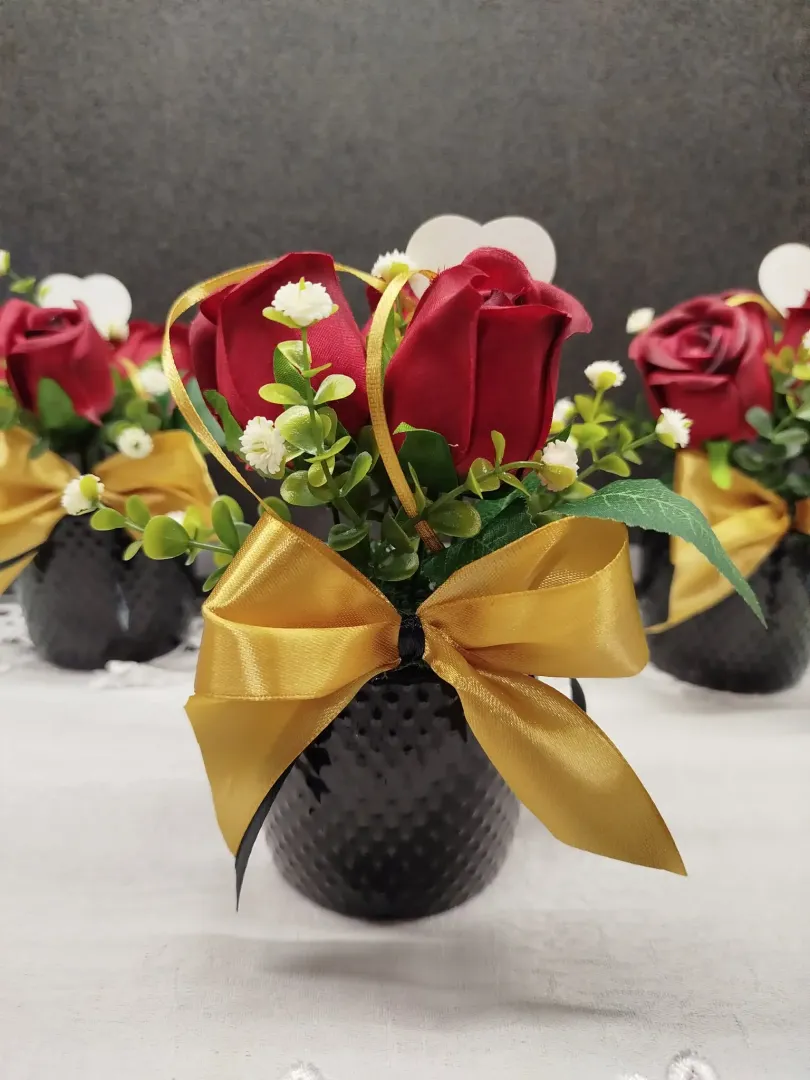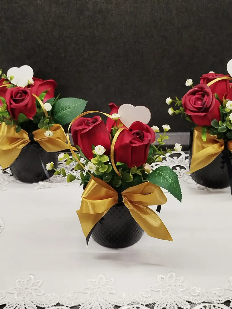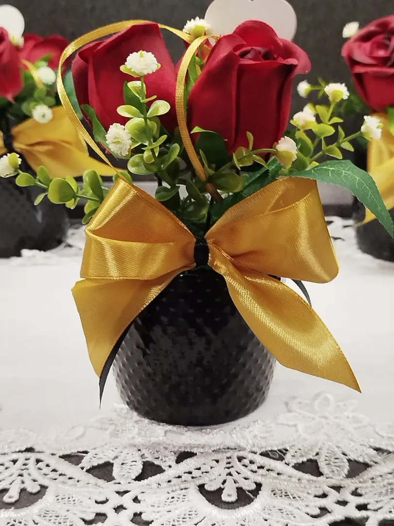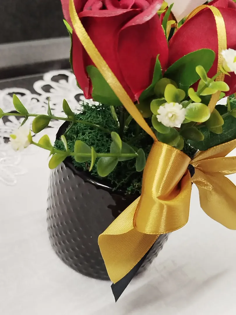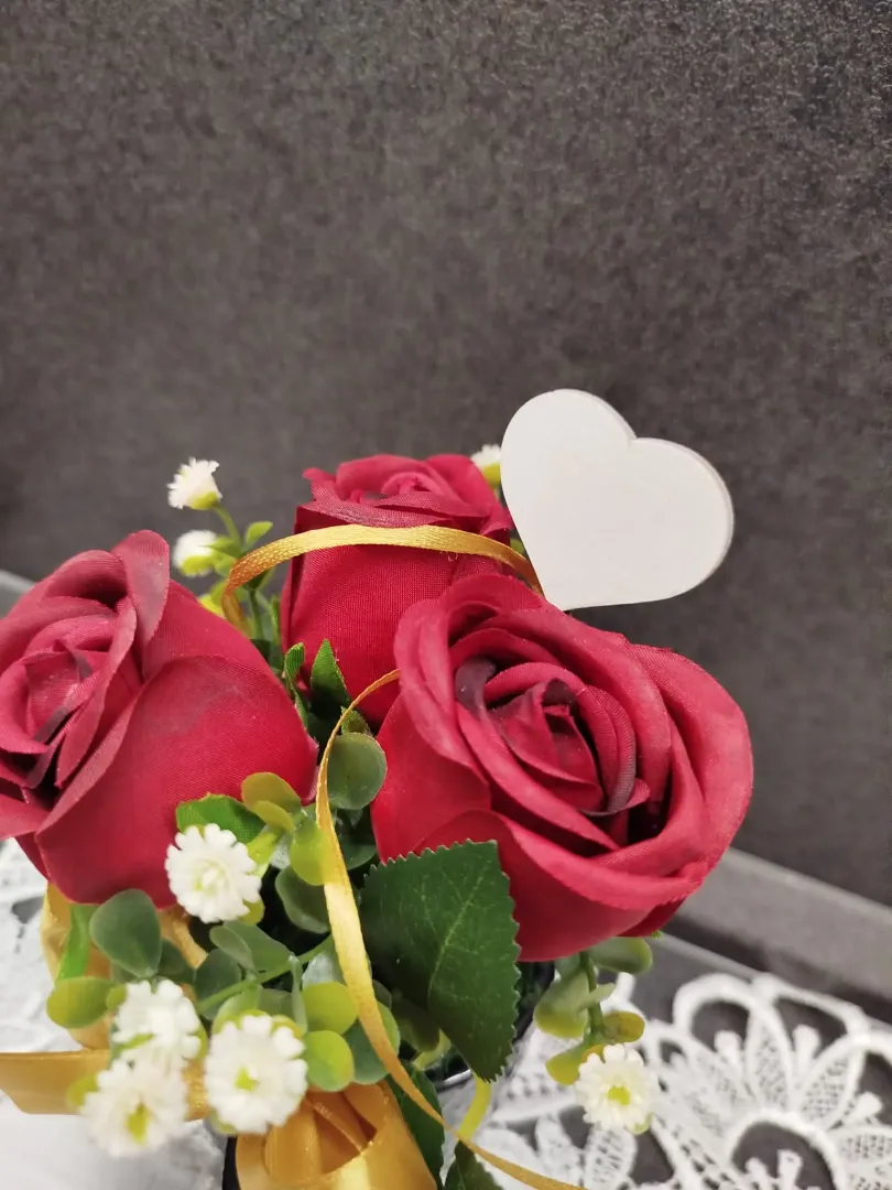 Dobd fel otthonod hangulatát ezzel a bájos, romantikus dekorációval! A bordó rózsák, a finom zöld levelek és az apró fehér virágok harmonikus összhangban teszik igazán különlegessé ezt az elegáns dekorációt. Tökéletes választás ajándéknak, saját részre! Nem igényel gondozást, mégis mindig mutatós marad.