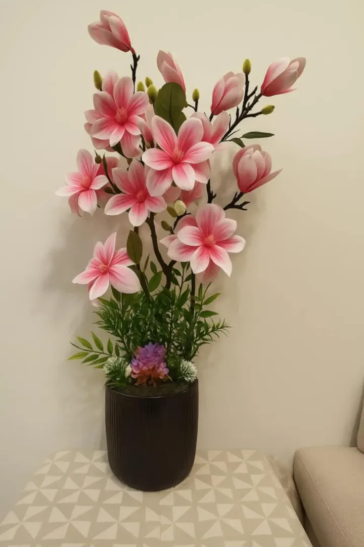 Ez a kézműves művirág kompozíció igazi színfoltja lehet bármely otthonnak! A rózsaszín- fehér magnólia művirágok szemet gyönyörködtető részletességgel készültek, és egy stílusos fekete kaspóban kaptak helyet, melyet természetes moha és zöld dísznövények egészítenek ki. Tökéletes választás, ha egy kis életet vinnél belső terekbe anélkül, hogy gondoskodást igényelne, hiszen ez egy művirág ami örökké szép marad. Legyen szó nappaliról, előszobáról vagy irodáról, ez a lakásdekor garantáltan harmóniát sugároz.