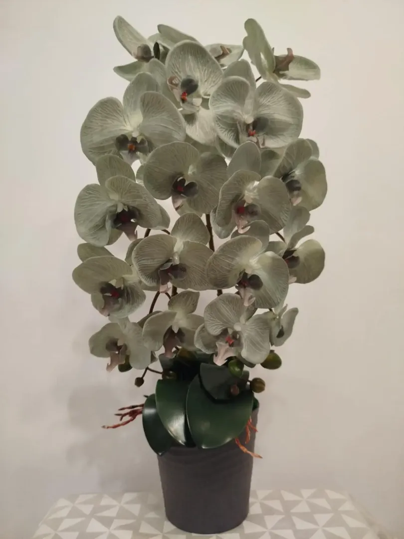 Ez a világoszöld orchidea szürke kaspóban, puha mohával kiegészítve üde színfoltja lehet bármelyik otthonnak. A kézműves művirág egyedisége és élethű megjelenése gondozásmentes szépséget kínál. A természetes zöld árnyalat nyugalmat áraszt, a modern szürke kaspó pedig stílusosan ellensúlyozza. Tökéletes választás, ha szeretnél egy kis friss energiát vinni a nappaliba, dolgozószobába vagy akár az előszobába!